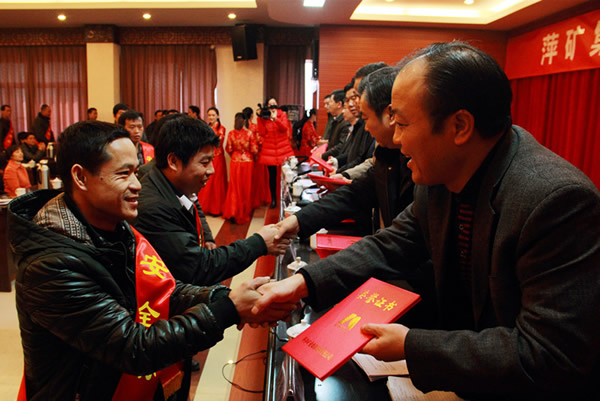 图为安全工作会上集团乐玩lewin|官网领导为2014年度安全标兵颁奖。黄优中 摄