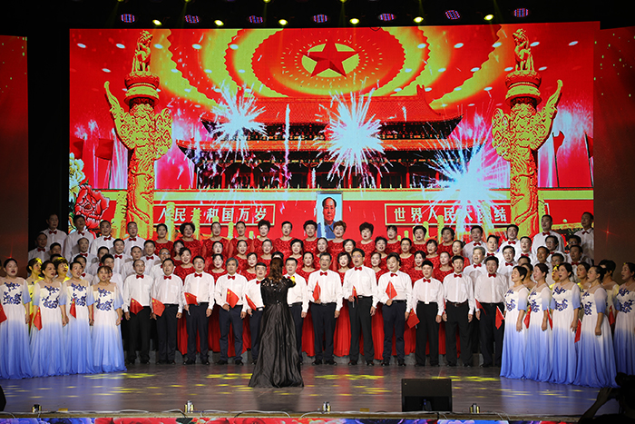 演出最后,萍矿集团全体领导班子成员参与的百人大合唱《没有共产党就没有新中国》把气氛再次推向高潮,表达了萍矿儿女对党和国家的深情与祝愿。嘹亮的歌声,在现场久久回荡。大家手挥红旗,定格永恒。