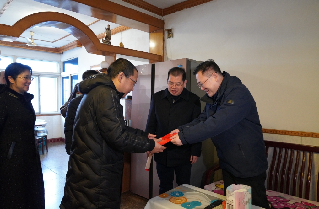 在浮法玻璃厂职工李坚家中,鲍峰庭仔细询问他的生活情况及健康状况。了解到李坚妻子无工作,大儿子先天性残疾,小儿子尚在求学,母亲已85岁高龄且体弱多病,父亲病故前在医院ICU抢救半个多月,花费巨大,家庭经济困难,鲍峰庭送上慰问金,鼓励他要保持乐观心态,坚定信心、振奋精神。并叮嘱有关部门要持续加大帮扶力度,帮助困难职工解决急难愁盼问题,让职工切实感受到党和政府、工会组织、企业的关怀与温暖。刘占纯还为李坚送上充满着新春祝福的春联。
