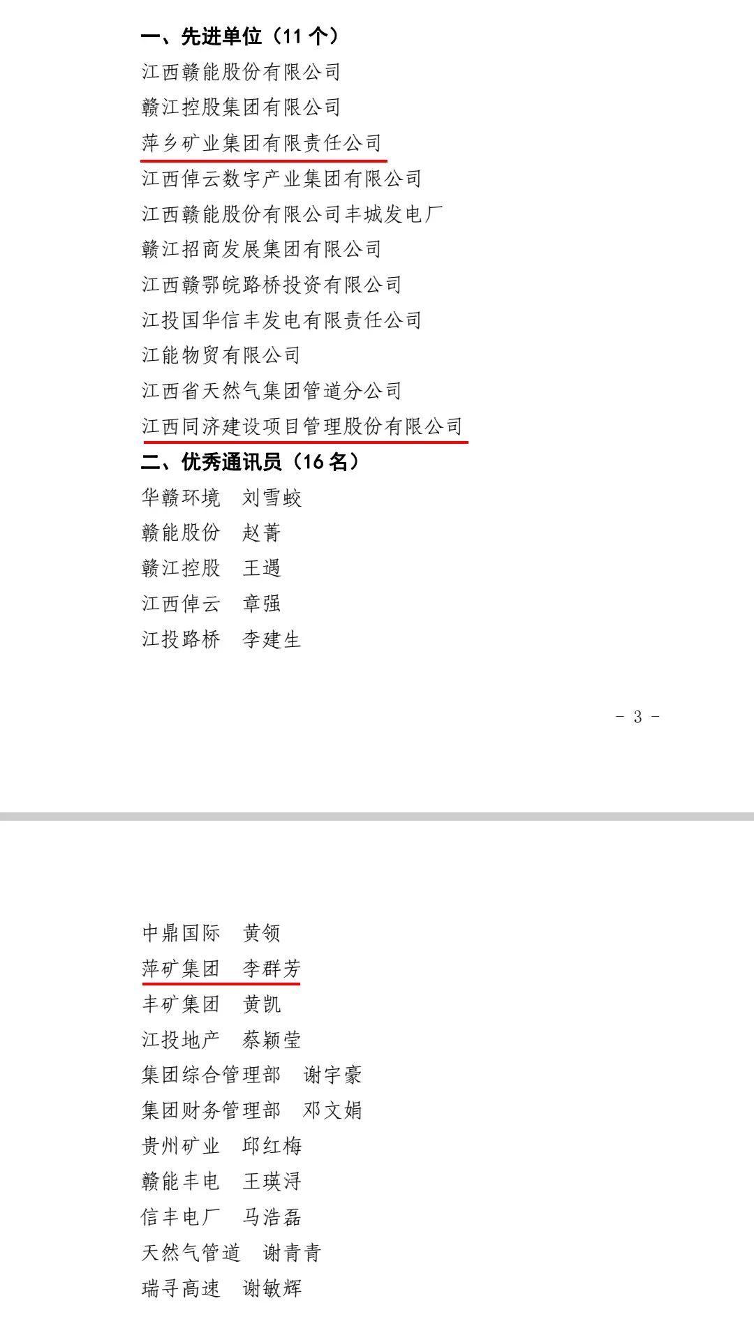 日前,江投集团下发《关于表彰2022—2023年度集团乐玩lewin|官网新闻宣传工作先进单位和优秀通讯员的通报》,通报表彰了一批先进集体和先进个人,萍矿集团2个集体、1名职工名列其中。