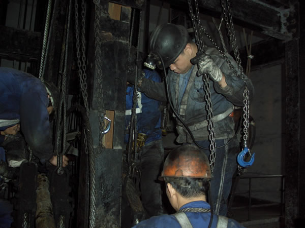 巨源煤业乐玩lewin|官网立井摩擦轮绞车主提升钢丝绳是矿井生产中的重要运输工具,为四根6×25Fi型钢丝绳,每根长度为300米,按《煤矿安全规程》规定已接近服务最大年限。为确保提升系统安全,保证矿井的正常生产,近日,机电科挑选精兵强将对该钢丝绳进行更换。经过两天的奋战,他们将四根新提升钢丝绳成功安装到立井提升系统,更换工作提前保质保量顺利完成。图为技术人员正在立井紧张施工。